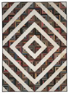 The blocks looked to be about seven inches square, arranged in fourteen rows of ten blocks each. Sylvia’s first glance took in shirting flannels and chintzes, calicoes and velvets–the scraps of worn clothing, no doubt. The scraps had been cut in rectangles of various sizes and pieced in an interlocking fashion around a central square, light fabrics placed on one side of a diagonal, dark fabrics on the other. The blocks were arranged in a Barn Raising setting so that the overall pattern was one of concentric diamonds, alternately light and dark, just as Lucinda’s description had foretold. And to Sylvia’s amazement and gratitude, the central squares of each Log Cabin block were black.