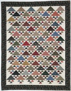 The pattern caught Sylvia’s eye first: Birds in the Air blocks, each a square divided along the diagonal, a solid right triangle of medium or dark fabric on one side, three small right triangles surrounded by lighter background fabrics on the other. The blocks were arranged on point so that all the right angles of the triangles, large and small, pointed in the same direction. The fabrics themselves seemed to be primarily muslins and wools, so faded and worn that Sylvia could only guess their original colors. Water stains and deterioration suggested age as well as rough handling, as did the muted colors of the once-bright dyes and the worn binding, through which the cotton batting was visible. Fine stipple quilting held the three layers together–where they were still held together. Elsewhere, the thread had been removed or torn out by accident, and the middle batting layer it should have held in place was long gone.