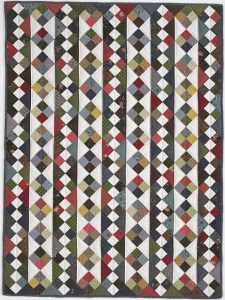 Her curiosity whetted, Sylvia carefully unfolded the third quilt and laid it beside the others. It was slightly larger than the Log Cabin quilt, and Sylvia soon found fabrics identical to those in the Birds in the Air quilt. That suggested the same hands had pieced both, but Sylvia wasn’t convinced. The pattern, four-patches in a vertical strip set, seemed no more complex than the Birds in the Air or Log Cabin, but only at first glance. By alternating the background fabric in adjacent rows, the quilter had created dark and light stripes, as well as a more difficult project, one with more seams to match and bias edges that might have stretched out of place if she had not been careful. And while the three layers were held together by simple concentric curves, the stitches themselves were smaller and finer, often seeming to disappear into the surface, as if the quilt had been etched with a feather.