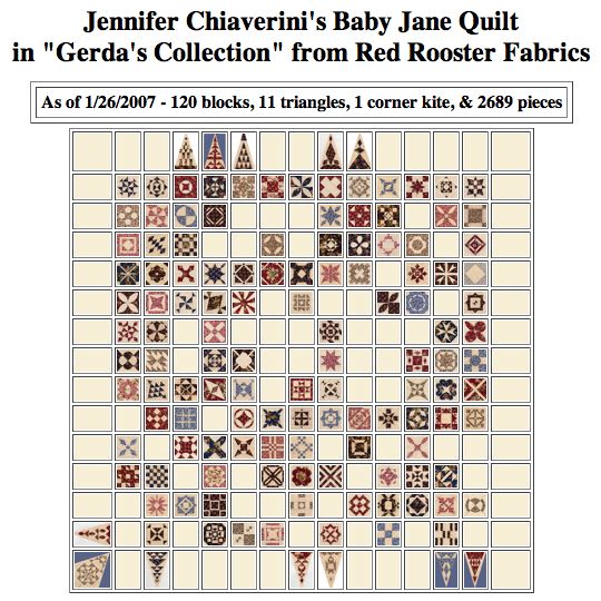 I have long admired the elaborate sampler quilt Brenda Papadakis wrote about in her book Dear Jane: The Two Hundred Twenty-Five Patterns from the 1863 Jane A. Stickle Quilt. In November 2003, I began my own Baby Jane quilt using the fabrics from my second Red Rooster Fabrics line, “Gerda’s Collection.”