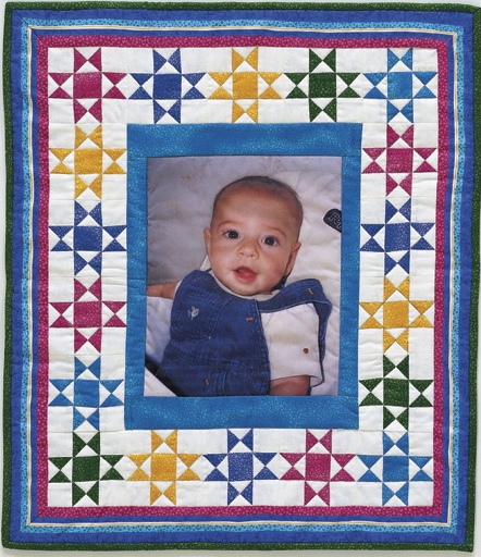 In The Cross-Country Quilters, renowned quilt artist and historian Grace Daniels takes her first steps toward overcoming “quilter’s block” in a photo transfer workshop. She makes a small wall hanging as a birthday gift for her fellow Cross-Country Quilter Vinnie; for my version, I used a photo of my youngest son, Michael. The pattern for “Grace’s Gift” appears in my second pattern book, Return to Elm Creek (C&T Publishing, 2004).