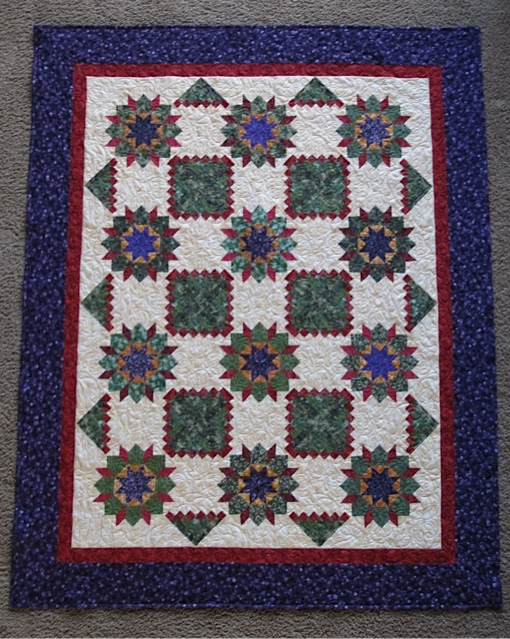 When the Elm Creek Quilters celebrate their annual Quilter’s Holiday with a daylong quilting marathon, Sylvia’s task is to complete a quilt to sell at her church’s Holiday Boutique, a fundraiser for a local food pantry. Chimneys and Cornerstones blocks frame Star of the Magi blocks, and the rich red, green, gold, and purple fabrics add the perfect seasonal touch to “Holiday Blessings.”