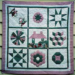 My first quilt (9/94): A nine-block sampler from a Leisure Arts booklet titled, “Teach Yourself to Quilt.” (If you look carefully, you may be able to detect four, not two, baskets in the block in the upper left corner. As you can see, I had a lot to learn about contrast.) People often ask if I had a teacher like Sylvia Compson, but unfortunately, I only wish I had. I’m a self-taught quilter whose skills have developed thanks to the many wonderful instructional quilting books and magazines out there, as well as the help of my on-line quilting friends from rec.crafts.textiles.quilting.